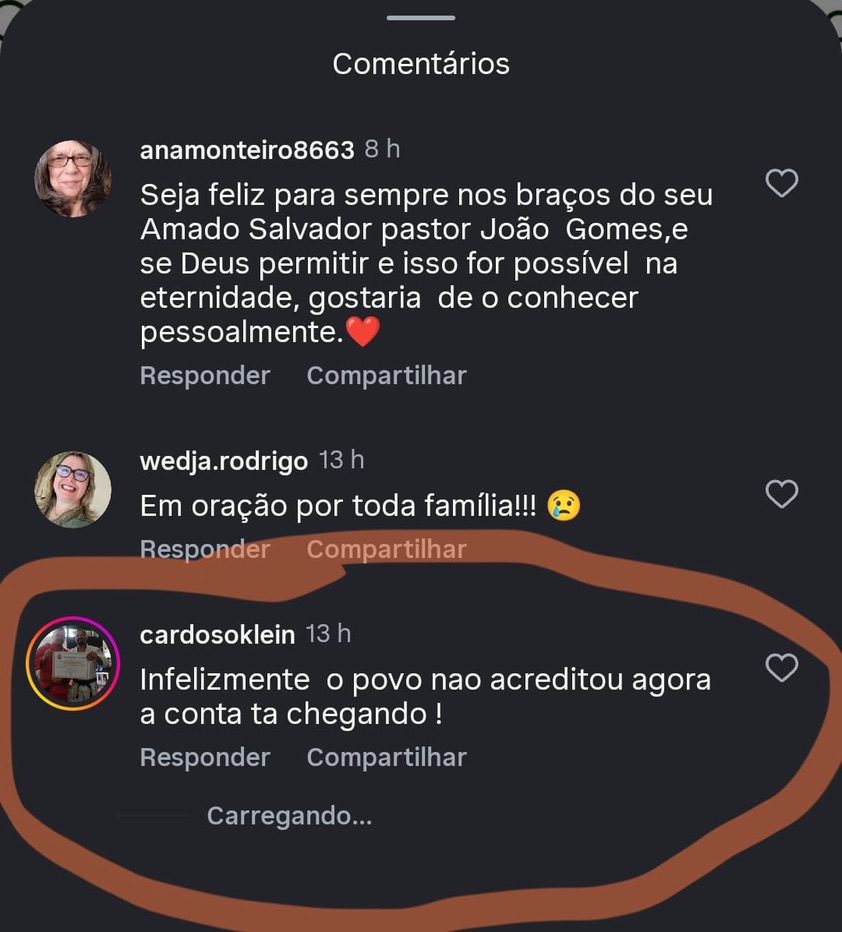 Mas, para horror de qualquer pessoa minimamente sensível, começaram a surgir manifestações cruéis de membros da ICM celebrando ou insinuando que sua morte seria juízo de Deus. Nos comentários anexados, vê-se a brutalidade nua: um usuário escreve “Já foi pra vala”; outro afirma que “a conta tá chegando”, em clara associação entre o falecimento do ex-pastor e uma suposta punição divina.