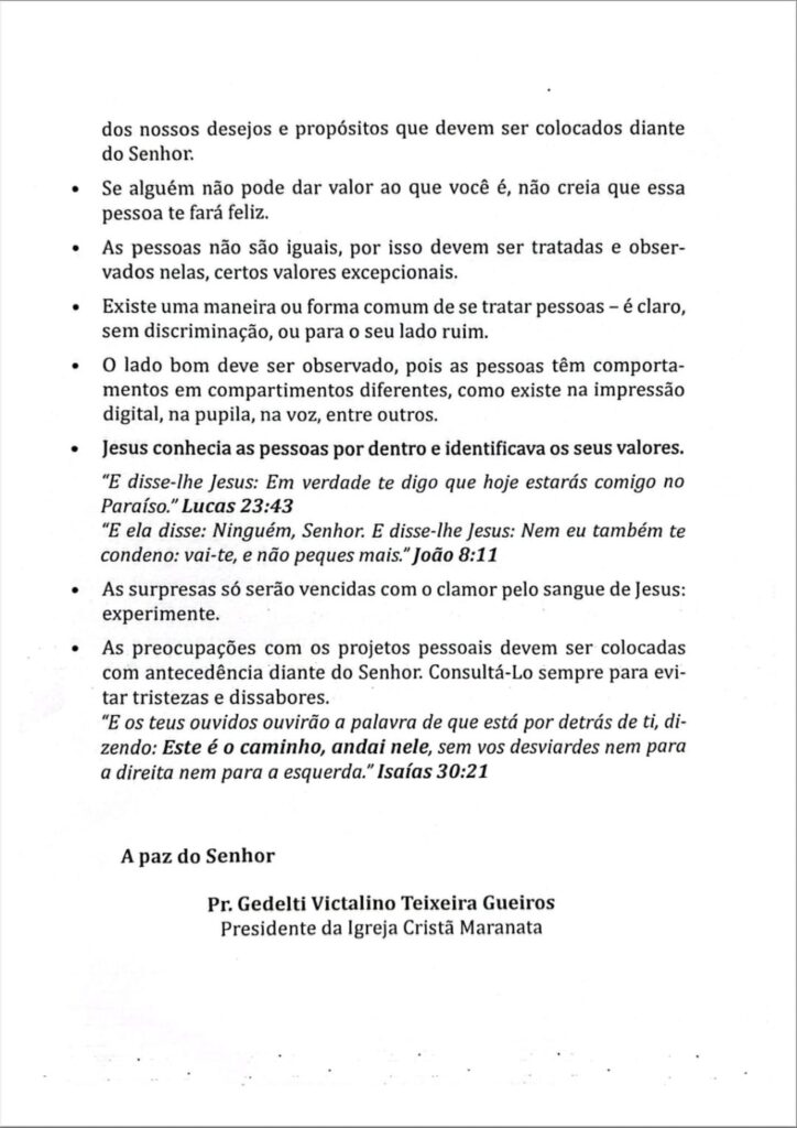 No dia 28 de junho de 2025, o presidente da Igreja Cristã Maranata, Gedelti Gueiros, publicou no Maanaim de Domingos Martins um texto intitulado “Conselhos para sua vida”, assinado por ele próprio como orientação aos membros da denominação.