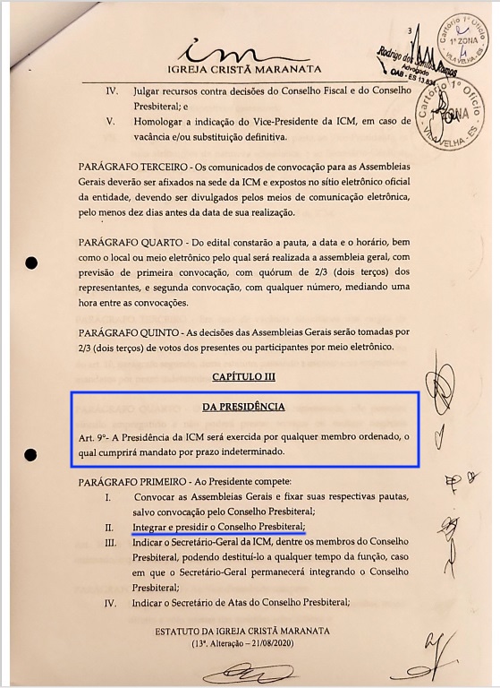 De acordo com o art. 9, inciso II, o Presidente da ICM é também o Presidente do Conselho Presbiteral. Além disso: