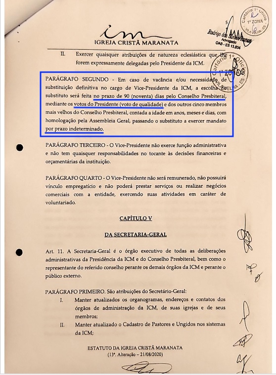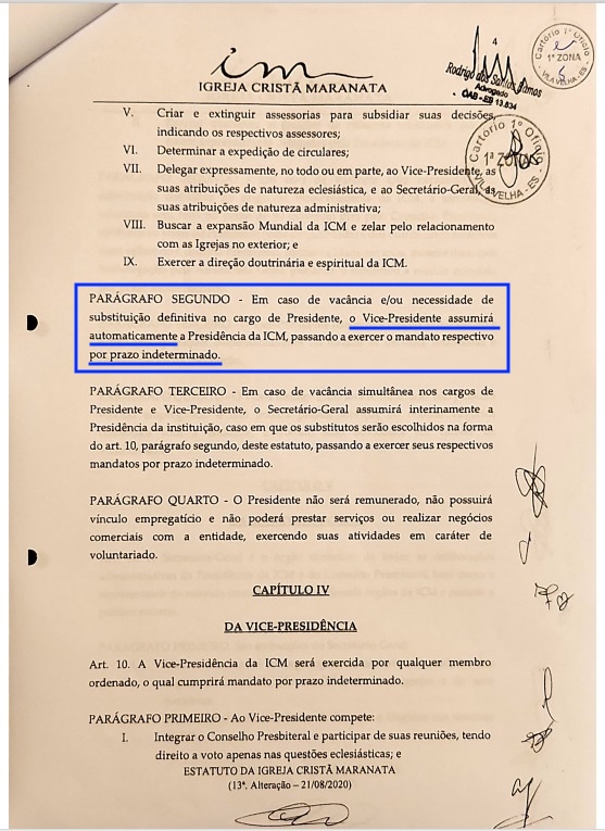 Segundo o art. 9, §2º do Estatuto da ICM, em caso de vacância do cargo de Presidente, o Vice-Presidente assume automaticamente o cargo de forma vitalícia e por prazo indeterminado.